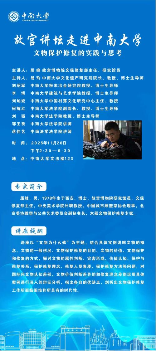 【讲座预告】屈峰:故宫讲坛走进中南大学:文物保护修复的实践与思考