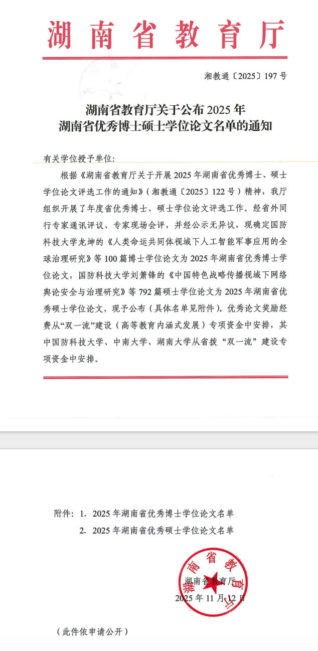 湖南省优秀硕士学位论文评选工作由湖南省人民政府学位委员会、湖南省教育厅共同组织,旨在提升湖南省研究生培养与学位授予质量、激励研究生创新热情、培养高层次创新型人才。该评选为全省研究生提供了高水平的学术成果展示平台,也有力促进了研究生教育水平的提升。