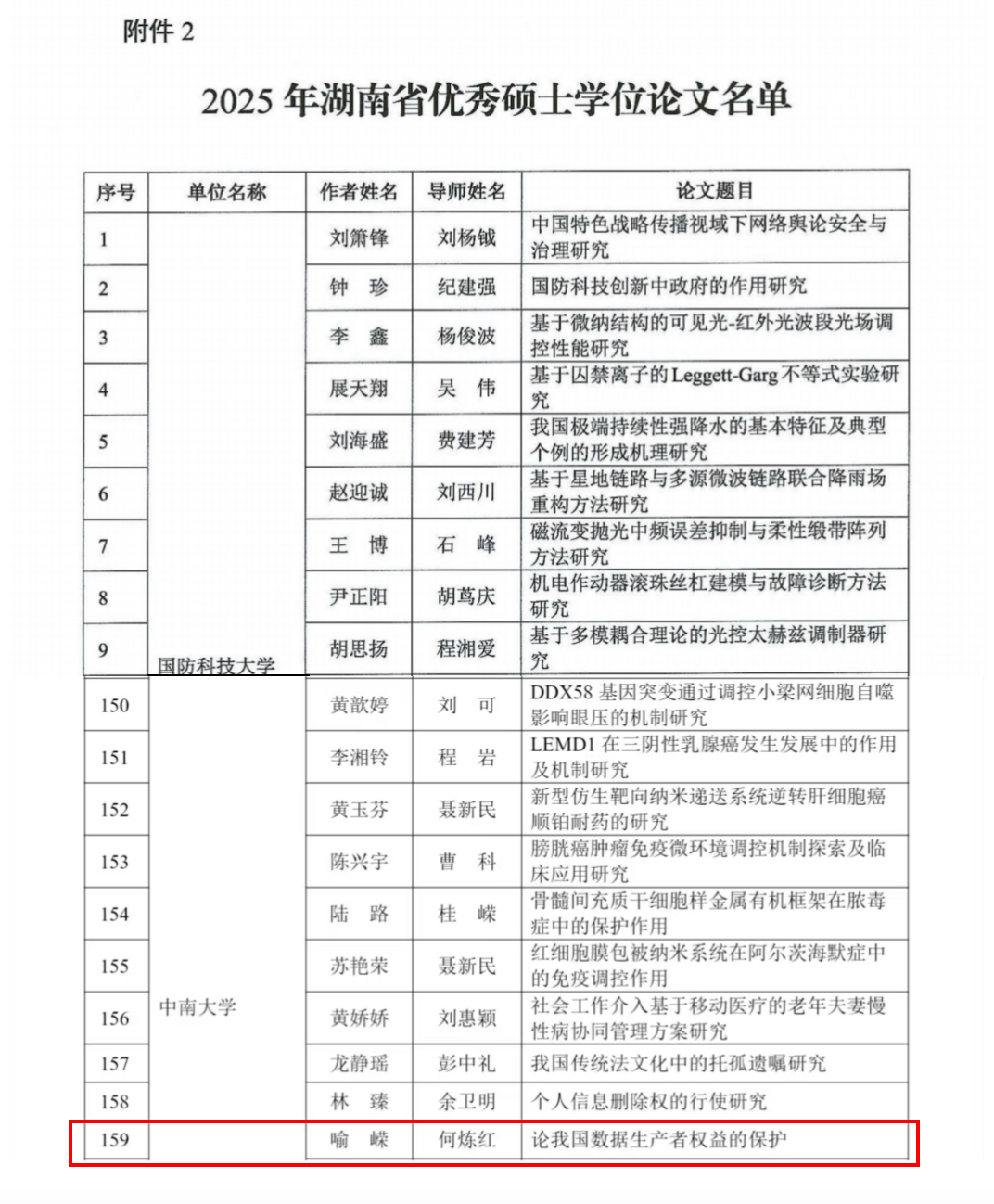 近日,湖南省教育厅公布2025年湖南省优秀硕士学位论文名单,中南大学知识产权法学2020级硕士研究生喻嵘撰写的硕士学位论文《论我国数据生产者权益的保护》(指导老师:何炼红教授)获评2025年度“湖南省优秀硕士学位论文”。