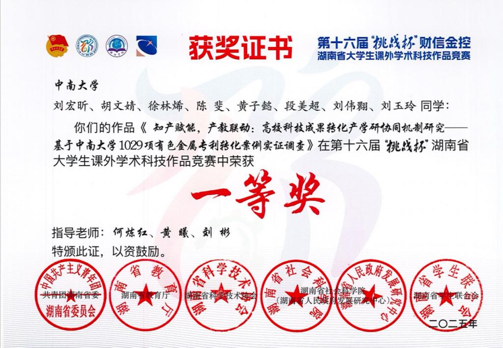 2025年6月13日,由共青团湖南省委员会、湖南省教育厅等单位共同主办的第十六届“挑战杯”财信金控湖南省大学生课外学术科技作品竞赛获奖名单揭晓,中南大学法学院报送的参赛项目《知产赋能,产教联动:高校科技成果转化产学研协同机制研究——基于中南大学1029项有色金属专利转化案例实证调查》(负责人:刘宏昕;指导老师:何炼红、黄曦、刘彬;团队成员:胡文婧、徐林烯、陈 斐、黄子懿、段美超、刘伟翾、刘玉玲)获评第十六届“挑战杯”湖南省大学生课外学术科技作品竞赛“一等奖”。